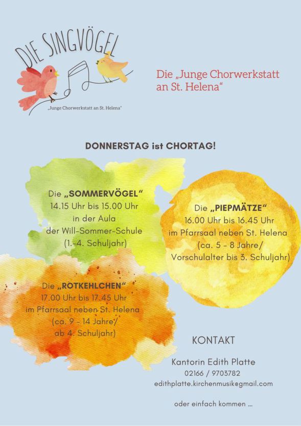 Kantorin Edith Platte 02166 / 9703782 oder edithplatte.kirchenmusik@gmail.com