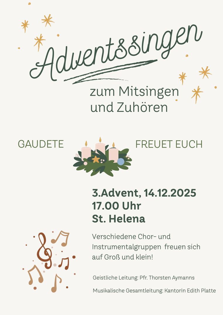 Chor- und Instrumentalgruppen (Gospelchor Inspiration, der Instrumentalkreis und der Posaunenchor der evangelischen Kirchengemeinde Rheindahlen, „Cantica Nova“ aus Hardterbroich, die „Singvögel“, der Kirchenchor Rheindahlen) laden unter der Gesamtleitung von Kantorin Edith Platte am Sonntag, den 14.12.2025 herzlich zum Zuhören und Mitsingen ein.